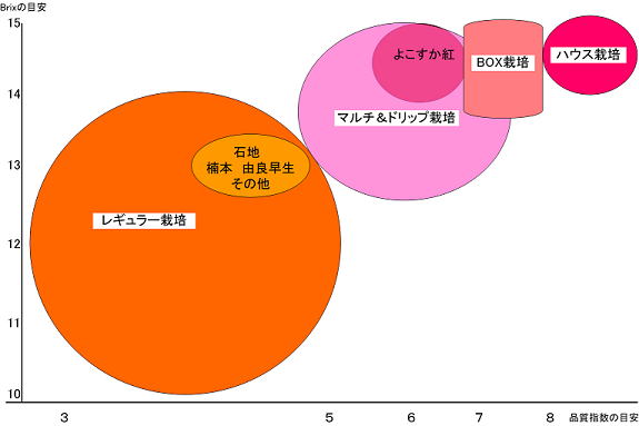 登園のみかん栽培品目のラインナップとして糖度の目安と栽培者が感じる品質の差を指数で表示してみました。
