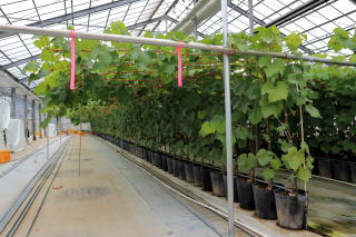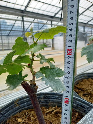 2021年3月にトマト栽培ハウスの片隅にロークウールのキューブに挿し木したシャインマスカットを4月に5号鉢に鉢上げ後、5月に8号鉢に鉢上げした直後の様子。